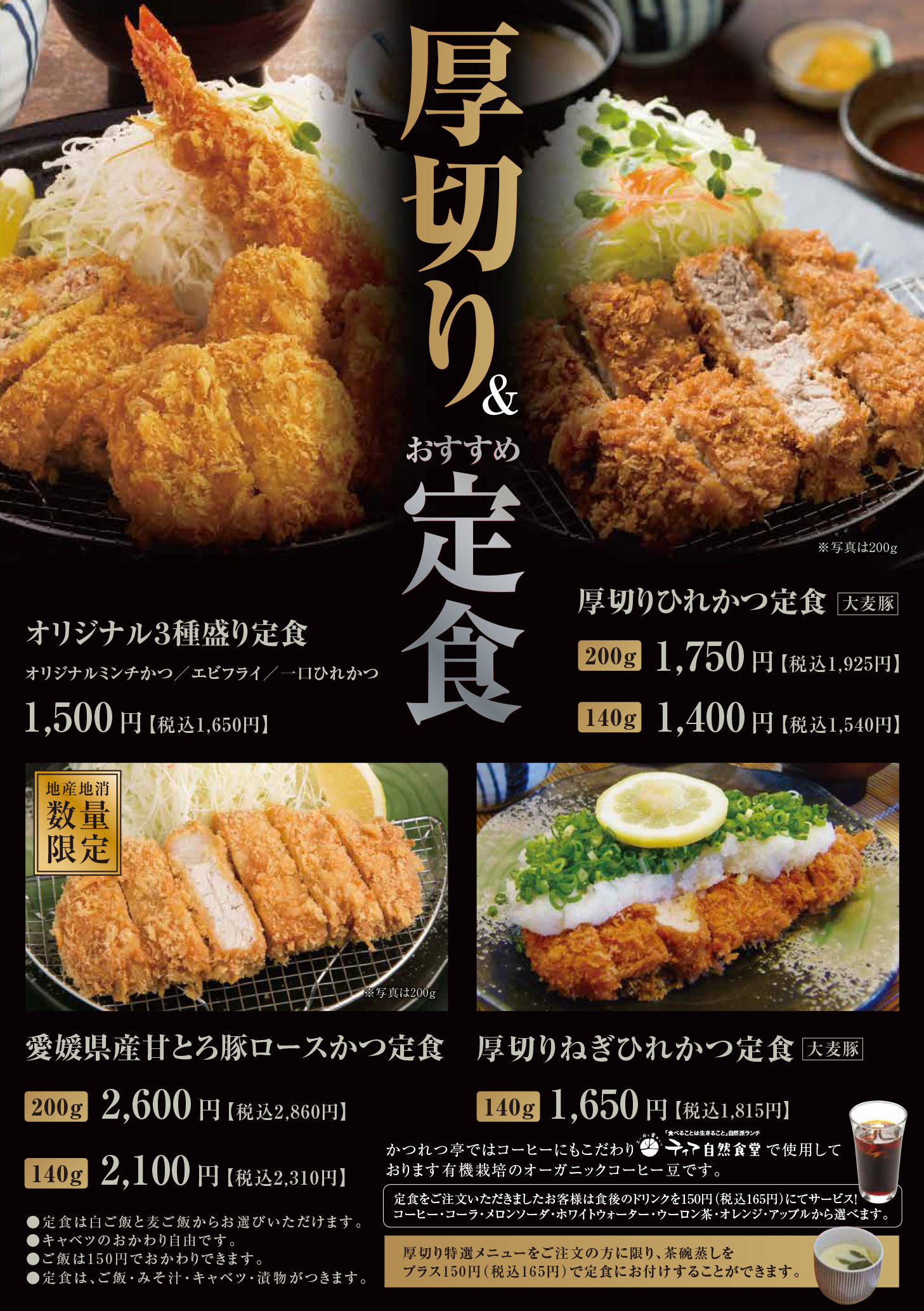 | 今治店 お持ち帰りメニュー | 新居浜店 お持ち帰りメニュー | 今治店 厚切りメニュー | 新居浜店 厚切りメニュー |