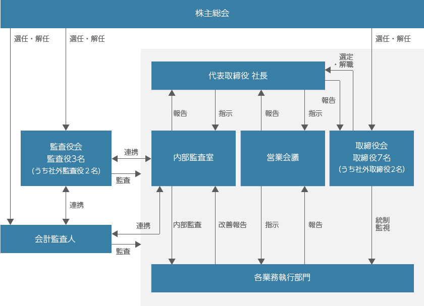 コーポレート・ガバナンス 当社は、経営の透明性・健全性を実現するために、経営方針決定プロセスの透明性の確保、相互牽制体制の強化、情報開示の推進等を通じて、コーポレート・ガバナンス機能を強化し、厳正かつ効率的な業務運営に努めていかなければならないと考えております。