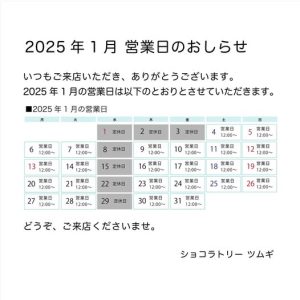 本日1月22日はショコラトリーツムギ本店は、お休みをいただいております。