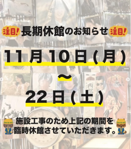 明日11月10日(月)~22日(土)まで臨時休館となります。